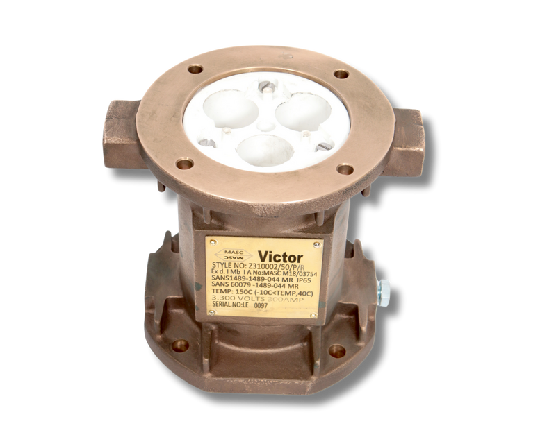 VICTOR PLUGS AND SOCKETS 300A 3.3kV Rated 300A continuous current. Crimped cable connections available for a range of cable sizes up to 120mm2. 3 Phase + 1 Pilot cores. Mechanically compatible with existing 3.3kV 300A equipment manufactured to comply with SANS 1489-1,4 & 60079-1-2. Compact and rugged design with fully replaceable parts.